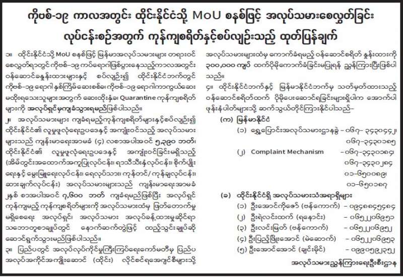 ကိုဗစ်-၁၉ ကာလအတွင်း ထိုင်းနိုင်ငံသို့ MoU စနစ်ဖြင့် အလုပ်သမားစေလွှတ်ခြင်း လုပ်ငန်းစဉ်အတွက် ကုန်ကျစရိတ်နှင့်စပ်လျဉ်းသည့် ထုတ်ပြန်ချက်