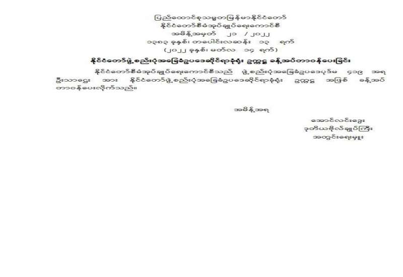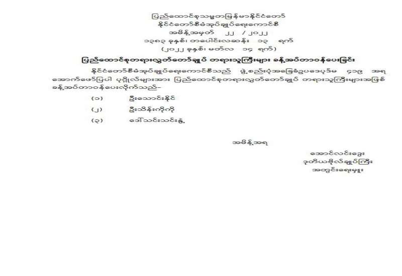 ပြည်ထောင်စုသမ္မတမြန်မာနိုင်ငံတော် နိုင်ငံတော်စီမံအုပ်ချုပ်ရေးကောင်စီ အမိန့်အမှတ် ၂၁ / ၂၀၂၂ ၁၃၈၃ ခုနှစ်၊ တပေါင်းလဆန်း ၁၃ ရက် (၂၀၂၂ ခုနှစ်၊ မတ်လ ၁၄ ရက်) နိုင်ငံတော်ဖွဲ့စည်းပုံ အခြေခံဥပဒေဆိုင်ရာခုံရုံးဥက္ကဋ္ဌ ခန့်အပ်တာဝန်ပေးခြင်း
