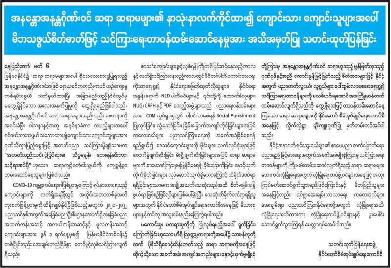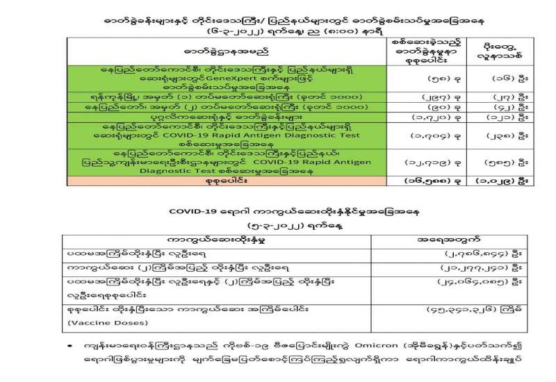 ကျန်းမာရေးဝန်ကြီးဌာနအနေဖြင့် နိုင်ငံအတွင်းကူးစက်ဖြစ်ပွားနေသော COVID-19 ရောဂါ ကာကွယ်၊ ကုသ၊ ထိန်းချုပ်ရေးလုပ်ငန်းများကို အရှိန်အဟုန်မြှင့်ဆောင်ရွက်လျက်ရှိရာ ရောဂါ ထိန်းချုပ်ရေးလုပ်ငန်းများ အောင်မြင်နိုင်ရေးအတွက် ပြည်သူလူထုအနေဖြင့် ကျန်းမာရေး ဝန်ကြီးဌာနမှ ထုတ်ပြန်ထားသော COVID-19 ရောဂါ ကာကွယ်ထိန်းချုပ်ရေးဆိုင်ရာ စည်းကမ်းများကို စနစ်တကျ လိုက်နာဆောင်ရွက်ရန် လိုအပ်ပြီး COVID-19 ကာကွယ်ဆေးထိုးနှံမှုခံယူခြင်းအား အထူးဂရုပြု ပူးပေါင်းဆောင်ရွက်ကြရန် လိုအပ်ပါသည်။