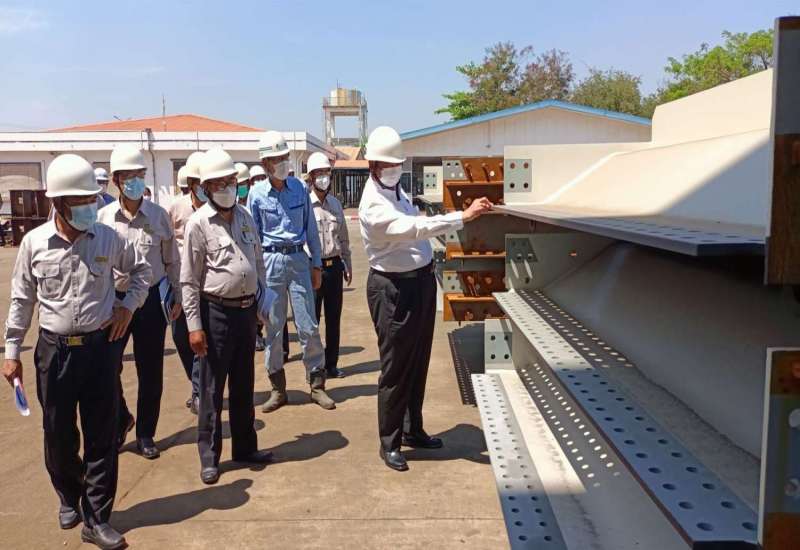 ဆောက်လုပ်ရေးဝန်ကြီးဌာန၊ ပြည်ထောင်စုဝန်ကြီး ဦးရွှေလေးသည် ယနေ့ နံနက်ပိုင်းတွင် ရန်ကုန်တိုင်းဒေသကြီး သာကေတမြို့နယ်၊ ရှုခင်းသာမြို့ပတ်လမ်းပေါ်ရှိ ဆောက်လုပ်ရေးဝန်ကြီးဌာနနှင့် ဂျပန်နိုင်ငံ JFE Engineering Corporation တို့ ပူးပေါင်းဆောင်ရွက်သည့် J & M Steel Solutions Co., Ltd သို့ ရောက်ရှိရာ J & M Steel Solutions Co., Ltd မှ တာဝန်ရှိသူက စက်ရုံအတွင်း သံပေါင်ထုတ်လုပ်မှုကို လိုက်လံရှင်းလင်း ပြသသည်။ ယင်းနောက်ပြည်ထောင်စုဝန်ကြီးနှင့် အဖွဲ့သည် ဘင်္ဂလားဒေ့ရှ်နိုင်ငံသို့ပေးပို့မည့် တံတားသံပေါင်များ ထုတ်လုပ်ထားမှုကို ကြည့်ရှုစစ်ဆေးသည်။