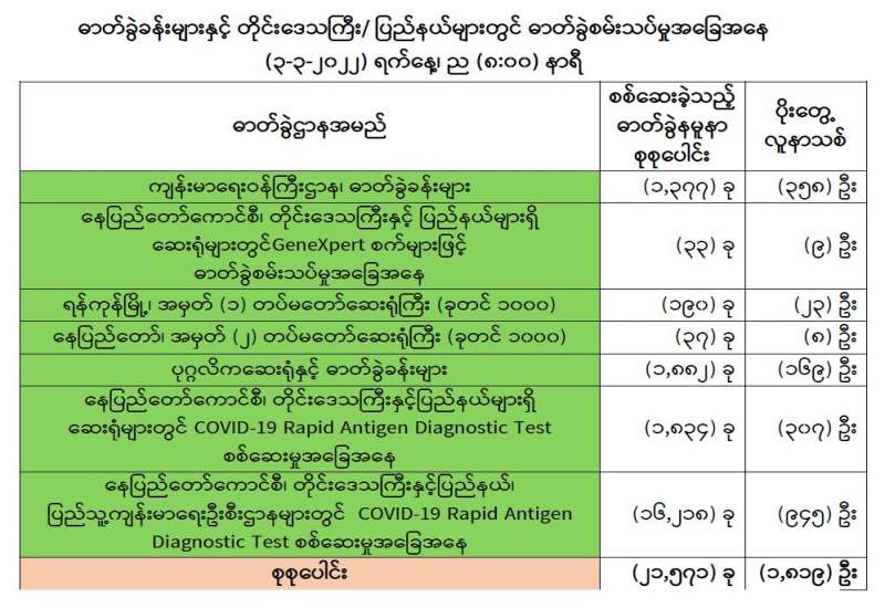 ကျန်းမာရေးဝန်ကြီးဌာနအနေဖြင့် နိုင်ငံအတွင်း ကူးစက်ဖြစ်ပွားနေသော COVID-19 ရောဂါ ကာကွယ်၊ ကုသ၊ ထိန်းချုပ်ရေးလုပ်ငန်းများကို အရှိန်အဟုန်မြှင့် ဆောင်ရွက်လျက်ရှိပါသည်။