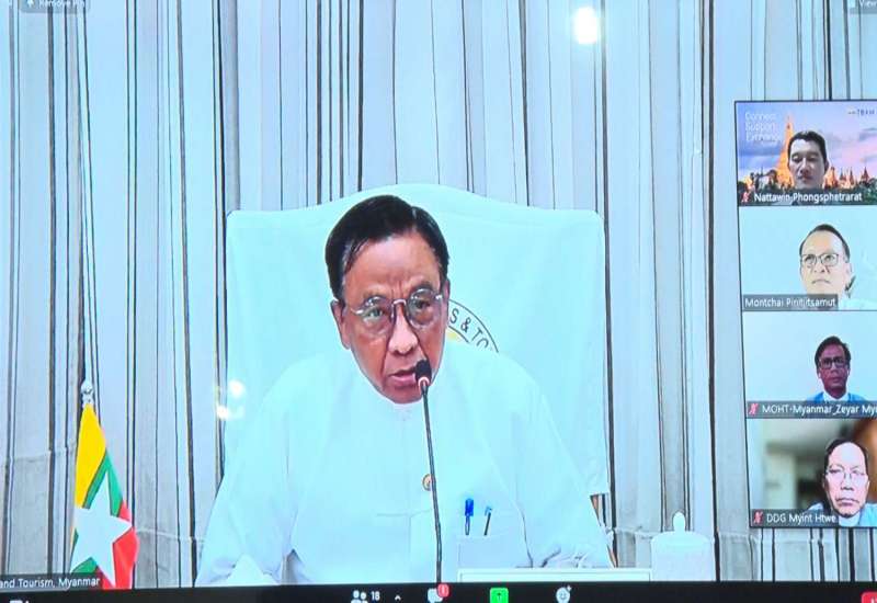 ဟိုတယ်နှင့်ခရီးသွားလာရေးဝန်ကြီးဌာန၊ ပြည်ထောင်စုဝန်ကြီး ဒေါက်တာဌေးအောင်သည် ယနေ့ မွန်းလွဲပိုင်းတွင် အဆိုပါဝန်ကြီးဌာန၊ နီလာခန်းမမှ ထိုင်းနိုင်ငံ၊ Kasetsart University မှကြီးမှူး၍ ကမ္ဘောဒီးယား၊ လာအို၊ မြန်မာ၊ ဗီယက်နမ်နှင့် ထိုင်းနိုင်ငံ တို့ပါဝင်သော CLMVT Forum ၏ အကျိုးကျေးဇူးများနှင့် ဖိုရမ်များ ဆက်လက်ကျင်းပရေးဆိုင်ရာ ညှိနှိုင်းဆွေးနွေးပွဲသို့ ဗီဒီယိုကွန်ဖရင့်စနစ်ဖြင့် တက်ရောက်သည်။
