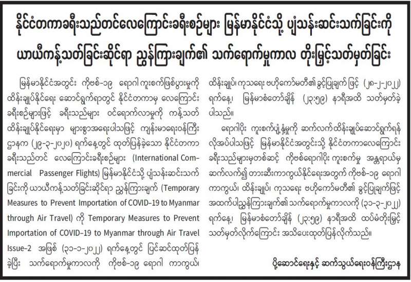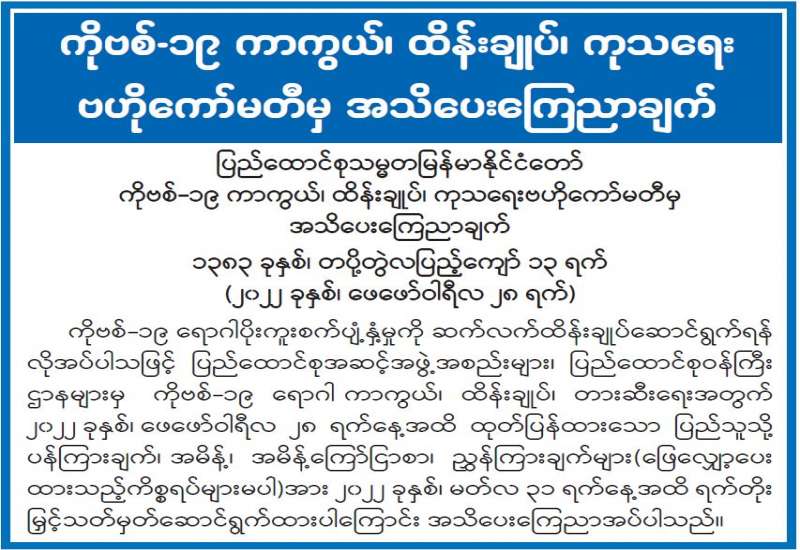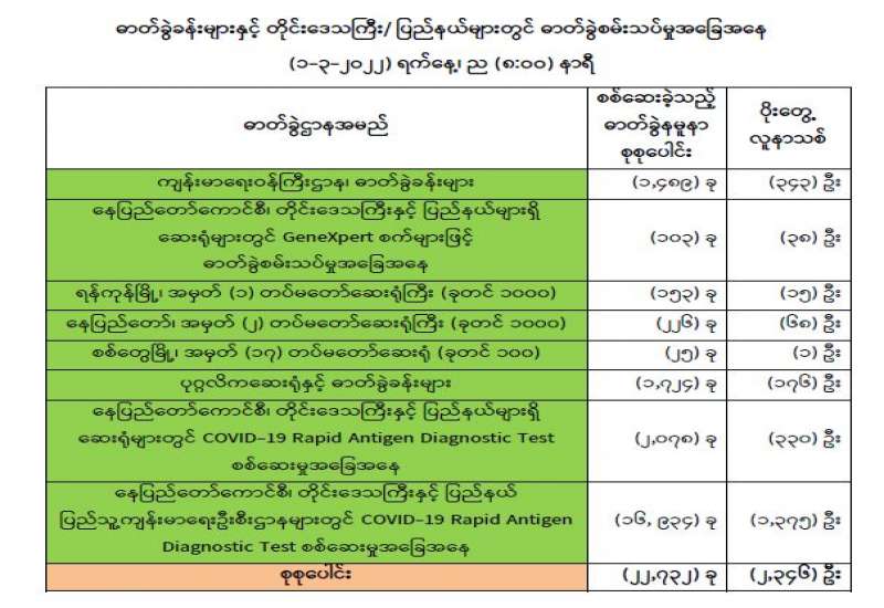(၁-၃-၂၀၂၂) ရက်နေ့၊ ည (၈:၀၀) နာရီ ကျန်းမာရေးဝန်ကြီးဌာနအနေဖြင့် နိုင်ငံအတွင်း ကူးစက်ဖြစ်ပွားနေသော COVID-19 ရောဂါ ကာကွယ်၊ ကုသ၊ ထိန်းချုပ်ရေး လုပ်ငန်းများကို အရှိန်အဟုန်မြှင့် ဆောင်ရွက်လျက်ရှိပါသည်။