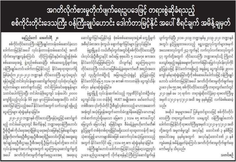 တရားမဝင်ကုန်သွယ်မှုတိုက်ဖျက်ရေး ဦးဆောင်ကော်မတီ၏ ကြီးကြပ်ကွပ်ကဲမှုဖြင့် တရားမဝင် ကုန်သွယ်မှုများကို ဥပဒေနှင့်အညီ ထိရောက်စွာ တားဆီးအရေးယူနိုင်ရေး ဆောင်ရွက်လျက်ရှိရာ ဖေဖော်ဝါရီ ၂၆ ရက်တွင် ချင်းပြည်နယ် တရားမဝင်ကုန်သွယ်မှု တိုက်ဖျက်ရေးအထူးအဖွဲ့၏ စီမံ ခန့်ခွဲမှုဖြင့် ပြည်နယ်သစ်တော ဦးစီးဌာနက ဦးဆောင်၍ ပူးပေါင်း စစ်ဆေးရေးအဖွဲ့များမှ စစ်ဆေးမှုများ ဆောင်ရွက်ခဲ့ရာ မင်းတပ်ခရိုင် ပလက်ဝမြို့နယ်အတွင်း တရားမဝင် ကညင်ခွဲသားဝဒသမ ၉၀၈၈ တန် (ခန့်မှန်းတန်ဖိုး ငွေကျပ် ၇၄၅၁) ကို ဖမ်းဆီးရမိခဲ့ပြီး သစ်တောဥပဒေနှင့်အညီ အရေးယူ ဆောင်ရွက်လျက်ရှိသည်။