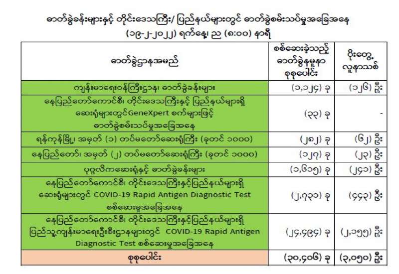 ကျန်းမာရေးဝန်ကြီးဌာနအနေဖြင့် နိုင်ငံအတွင်း ကူးစက်ဖြစ်ပွားနေသော COVID-19 ရောဂါ ကာကွယ်၊ ကုသ၊ ထိန်းချုပ်ရေး လုပ်ငန်း များကို အရှိန်အဟုန်မြှင့် ဆောင်ရွက်လျက်ရှိပါသည်။
