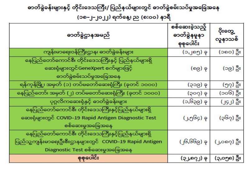 ကျန်းမာရေးဝန်ကြီးဌာနအနေဖြင့် နိုင်ငံအတွင်း ကူးစက်ဖြစ်ပွားနေသော COVID-19 ရောဂါ ကာကွယ်၊ ကုသ၊ ထိန်းချုပ်ရေးလုပ်ငန်းများကို အရှိန်အဟုန်မြှင့် ဆောင်ရွက်လျက်ရှိရာ ရောဂါ ထိန်းချုပ်ရေးလုပ်ငန်းများ အောင်မြင်နိုင်ရေးအတွက် ပြည်သူလူထုအနေဖြင့် ကျန်းမာရေး ဝန်ကြီးဌာနမှ ထုတ်ပြန်ထားသော COVID-19 ရောဂါ ကာကွယ်ထိန်းချုပ်ရေးဆိုင်ရာ စည်းကမ်း များကို စနစ်တကျလိုက်နာ ဆောင်ရွက်ရန်လိုအပ်ပြီး COVID-19 ကာကွယ်ဆေး ထိုးနှံမှု ခံယူခြင်းအား အထူးဂရုပြု ပူးပေါင်းဆောင်ရွက်ကြရန် လိုအပ်ပါသည်။