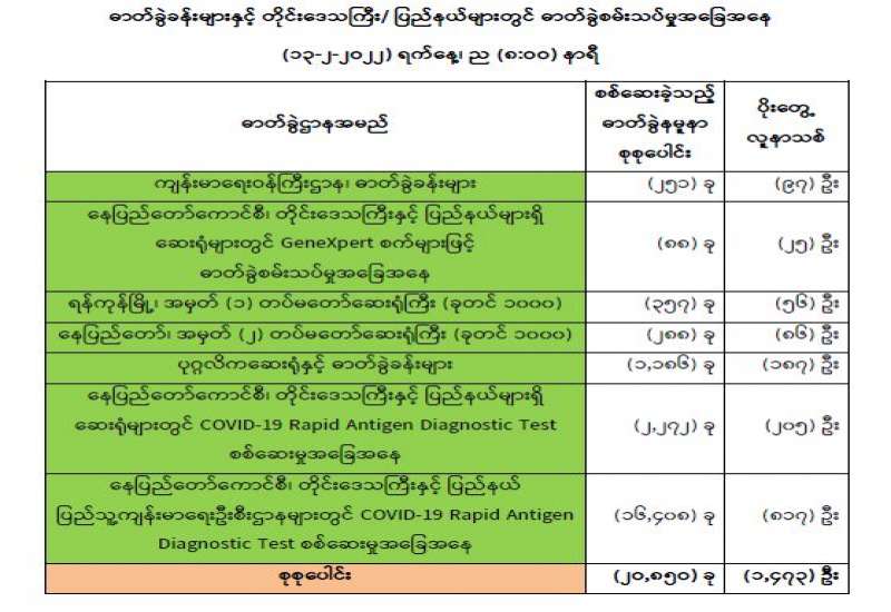 ကျန်းမာရေးဝန်ကြီးဌာနအနေဖြင့် နိုင်ငံအတွင်း ကူးစက်ဖြစ်ပွားနေသော COVID-19 ရောဂါ ကာကွယ်၊ ကုသ၊ ထိန်းချုပ်ရေးလုပ်ငန်းများကို အရှိန်အဟုန် မြှင့်ဆောင်ရွက်လျက်ရှိရာ ရောဂါထိန်းချုပ်ရေးလုပ်ငန်းများ အောင်မြင်နိုင်ရေးအတွက် ပြည်သူလူထုအနေဖြင့် ကျန်းမာရေးဝန်ကြီးဌာနမှ ထုတ်ပြန်ထား သော COVID-19 ရောဂါကာကွယ် ထိန်းချုပ်ရေးဆိုင်ရာ စည်းကမ်းများကို စနစ်တကျ လိုက်နာဆောင်ရွက်ရန်လိုအပ်ပြီး COVID-19 ကာကွယ်ဆေးထိုးနှံမှု ခံယူခြင်းအား အထူးဂရုပြု ပူးပေါင်းဆောင်ရွက်ကြရန် လိုအပ်ပါသည်။