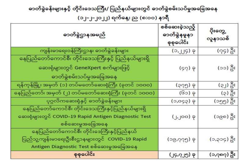 ကျန်းမာရေးဝန်ကြီးဌာနအနေဖြင့် နိုင်ငံအတွင်း ကူးစက်ဖြစ်ပွားနေသော COVID-19 ရောဂါ ကာကွယ်၊ ကုသ၊ ထိန်းချုပ်ရေး လုပ်ငန်းများကို အရှိန်အဟုန်မြှင့် ဆောင်ရွက်လျက်ရှိပါသည်။