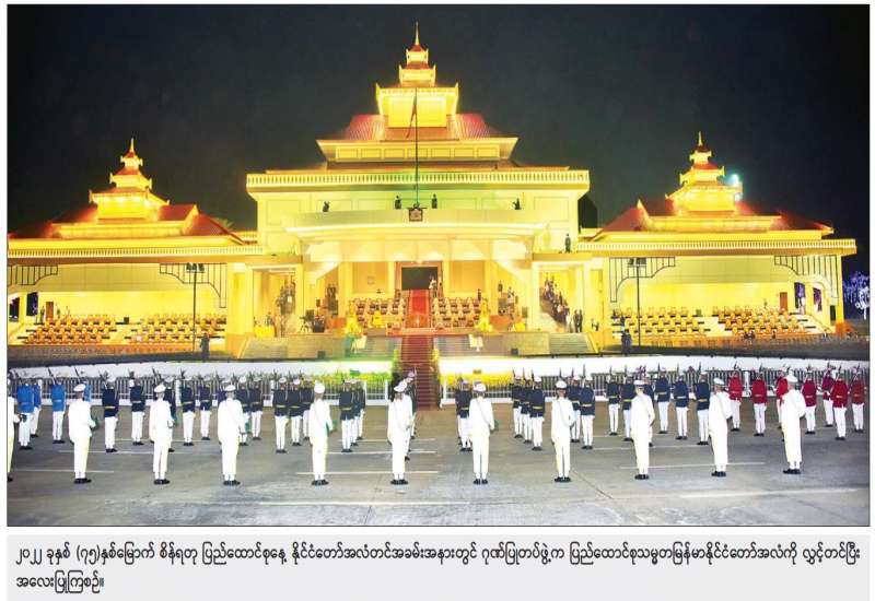 ၂၀၂၂ ခုနှစ် (၇၅)နှစ်မြောက် စိန်ရတုပြည်ထောင်စုနေ့ ဂုဏ်ပြုအခမ်းအနားကို ယနေ့နံနက်ပိုင်းတွင် နေပြည်တော်ရှိ ဗိုလ်ရှုခံရင်ပြင်၌ကျင်းပရာ နိုင်ငံတော် စီမံအုပ်ချုပ်ရေးကောင်စီဥက္ကဋ္ဌ နိုင်ငံတော်ဝန်ကြီးချုပ် ဗိုလ်ချုပ်မှူးကြီး မဟာသရေစည်သူ မင်းအောင်လှိုင် တက်ရောက် မိန့်ခွန်းပြောကြားပြီး ဂုဏ်ပြုစစ်ကြောင်းများ၏ အလေးပြုခြင်းကို ခံယူသည်။