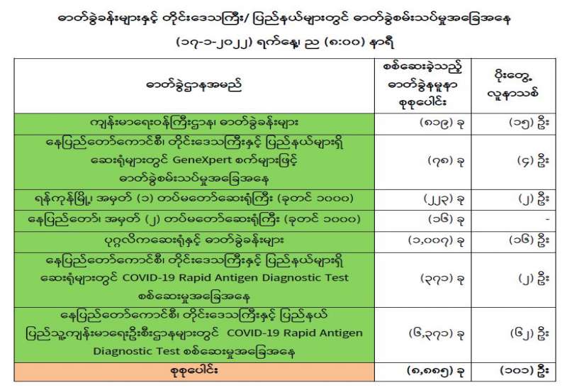 ကျန်းမာရေးဝန်ကြီးဌာနအနေဖြင့် နိုင်ငံအတွင်း ကူးစက်ဖြစ်ပွားနေသော COVID-19 ရောဂါ ကာကွယ်၊ ကုသ၊ ထိန်းချုပ်ရေးလုပ်ငန်းများကို အရှိန်အဟုန်မြှင့် ဆောင်ရွက်လျက်ရှိပါသည်။