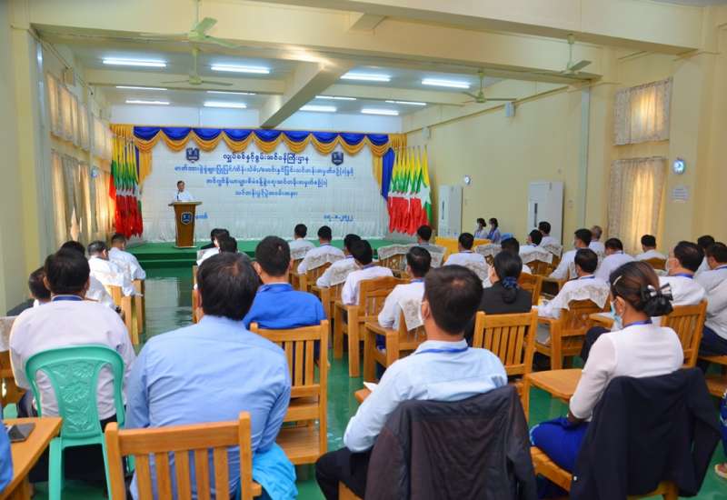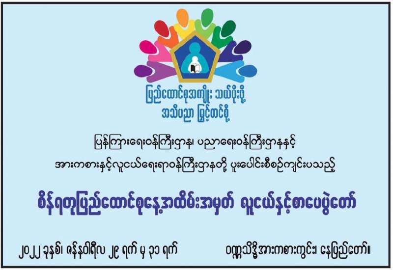 ဖွံ့ဖြိုးတိုးတက်မှုအလားအလာကောင်းတစ်ရပ်၏ ပြယုဂ်- ခေါင်းဆောင်မှုအရင်းအမြစ် တည် ဆောက်ခြင်းဆိုင်ရာ ဒုတိယအကြိမ်အလုပ်ရုံဆွေးနွေးပွဲ ဖွင့်ပွဲအခမ်းအနားကို ယနေ့နံနက် ၁၀ နာရီက ပြည်ထောင်စုရာထူးဝန်အဖွဲ့၊ ရုံးအမှတ် (၁၇)၊ စုပေါင်းခန်းမ၌ ကိုဗစ်-၁၉ ရောဂါဆိုင်ရာ ထုတ်ပြန်ထားရှိသော စည်းကမ်း သတ်မှတ်ချက်များနှင့်အညီ ကျင်းပသည်။