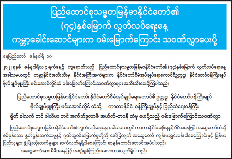 ၁။ ပြည်ထောင်စုသမ္မတ မြန်မာနိုင်ငံတော်အနေဖြင့် ကမ္ဘာ့ကျန်းမာရေးအဖွဲ့ (WHO) ၏ သတ်မှတ်ပြဋ္ဌာန်းချက်များနှင့်အညီ ကိုဗစ်-၁၉ ရောဂါပျံ့နှံ့မှုအား ကာကွယ်နိုင်ရန်အတွက် ပြည်ပ/ ပြည်တွင်း လိုက်နာရမည့် လုပ်ငန်းစဉ်များအား အပြည့်အဝ ချမှတ်ဆောင်ရွက်လျက်ရှိ သည်။ လတ်တလော ကမ္ဘာ့နိုင်ငံအသီးသီးတွင် ဖြစ်ပွားနေသည့် အိုမီခရွန်ဗိုင်းရပ်စ်ဗီဇမျိုးကွဲ ကူးစက်ပျံ့နှံ့မှုအား ကာကွယ်ထိန်းချုပ်နိုင်ရန် အတွက်ကျန်းမာရေးဝန်ကြီးဌာနမှ ၁၆-၁၂-၂၀၂၁ ရက်နေ့တွင် ထုတ်ပြန်ထားသော “အပြည်ပြည်ဆိုင်ရာ ဝင်/ထွက်ဂိတ်များနှင့် နယ်စပ်ဝင်/ ထွက်ဂိတ်များမှ မြန်မာနိုင်ငံသို့ လာရောက်မည့် ခရီးသွားများအတွက် အသွားလာကန့်သတ်မှုနှင့် ဓါတ်ခွဲစမ်းသပ် စစ်ဆေးခြင်း ဆောင်ရွက်မည့်အစီအစဉ်နှင့်စပ်လျဉ်း၍ ထပ်မံဖြည့်စွက်ထား သည့် လုပ်ငန်းစဉ်” ကြေညာချက်ကို ယင်းနေ့၌ပင် ရန်ကုန်မြို့အခြေစိုက် နိုင်ငံခြားသံရုံးများ၊ ကုလသမဂ္ဂဆိုင်ရာ အဖွဲ့အစည်းများနှင့် အပြည်ပြည်ဆိုင်ရာအဖွဲ့အစည်းများသို့ ပေးပို့ထားပြီး ယင်းအတိုင်း လိုက်နာရန် အသိပေးပြီးဖြစ်သည်။