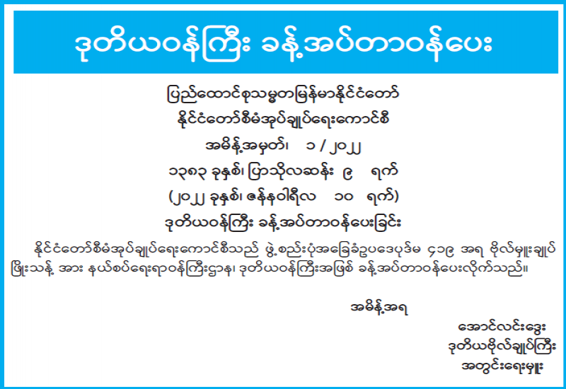 ပြည်ထောင်စုရွေးကောက်ပွဲကော်မရှင်နှင့် ကော်မရှင်အဖွဲ့ခွဲရုံးအဆင့် ဆင့်တို့တွင် တာဝန်ထမ်းဆောင်မည့် အမှုထမ်း(ဒုတိယဦးစီးမှူး)များ လုပ်ငန်းခွင်အကြို စွမ်းရည်မြှင့်သင်တန်း အမှတ်စဉ် (၁/၂၀၂၂) ဖွင့်ပွဲကို ယနေ့နံနက် ၉ နာရီခွဲတွင် အမှတ် (၃) စစ်ကြောရေးနှင့် တည်းခိုရေးတပ် ( ရွာတော် ) ဆင်ဖြူရှင်ခန်းမ၌ ကျင်းပသည်။
