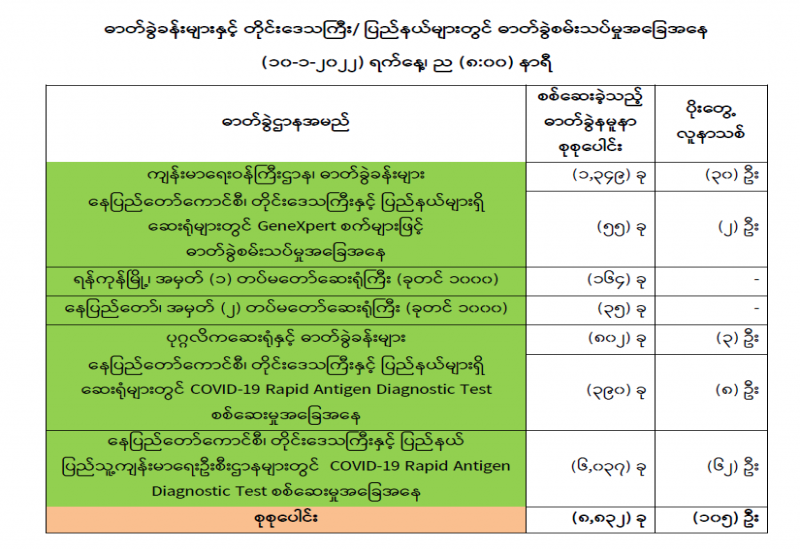 (၁၀-၁-၂၀၂၂) ရက်နေ့၊ ည (၈:၀၀) နာရီ ကျန်းမာရေးဝန်ကြီးဌာနအနေဖြင့် နိုင်ငံအတွင်း ကူးစက်ဖြစ်ပွားနေသော COVID-19 ရောဂါ ကာကွယ်၊ ကုသ၊ ထိန်းချုပ်ရေးလုပ်ငန်းများကို အရှိန်အဟုန်မြှင့် ဆောင်ရွက်လျက်ရှိပါသည်။