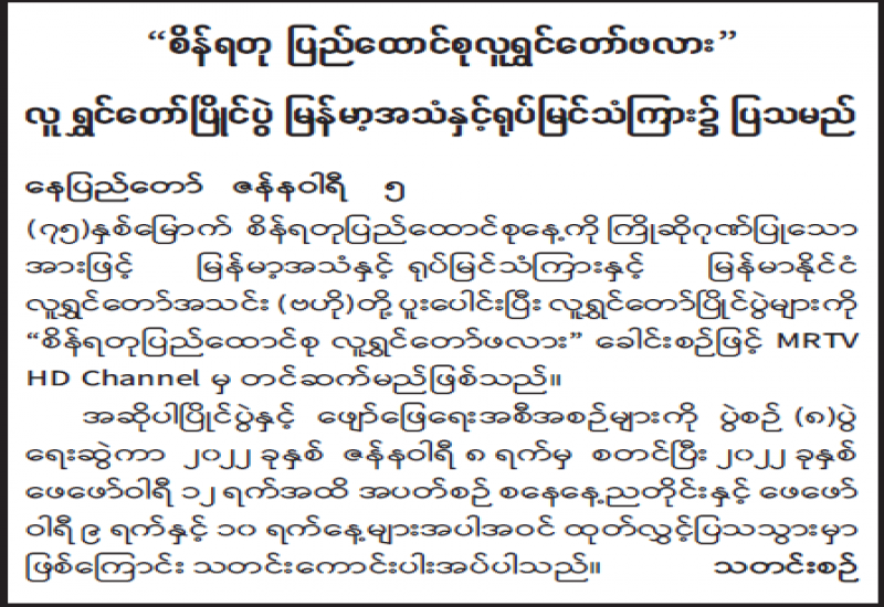 စိန်ရတု ပြည်ထောင်စုနေ့ကို ဂုဏ်ပြုသောအားဖြင့် “တူယှဉ် နွှဲပျော် ဂီတပွဲတော်” သီချင်းဆို ပြိုင်ပွဲ အုပ်စု(၄) ပထမပွဲစဉ်ကို ဇန်နဝါရီ ၇ ရက် (သောကြာနေ့) ညတွင် မြန်မာ့အသံနှင့်ရုပ်မြင် သံကြားမှတိုက်ရိုက် Liveရိုက်ကူး ထုတ်လွှင့်မည်။