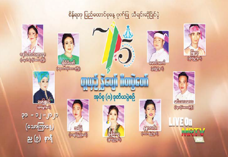 စိန်ရတု ပြည်ထောင်စုနေ့ကို ဂုဏ်ပြုသောအားဖြင့် “တူယှဉ် နွှဲပျော် ဂီတပွဲတော်” သီချင်းဆို ပြိုင်ပွဲ အုပ်စု (၃) ဒုတိယပွဲစဉ်ကို ဒီဇင်ဘာ ၃၁ရက် (သောကြာနေ့) ညတွင် မြန်မာ့အသံနှင့် ရုပ်မြင်သံကြားမှ တိုက်ရိုက် Live ရိုက်ကူးထုတ်လွှင့်မည်ဖြစ်သည်။