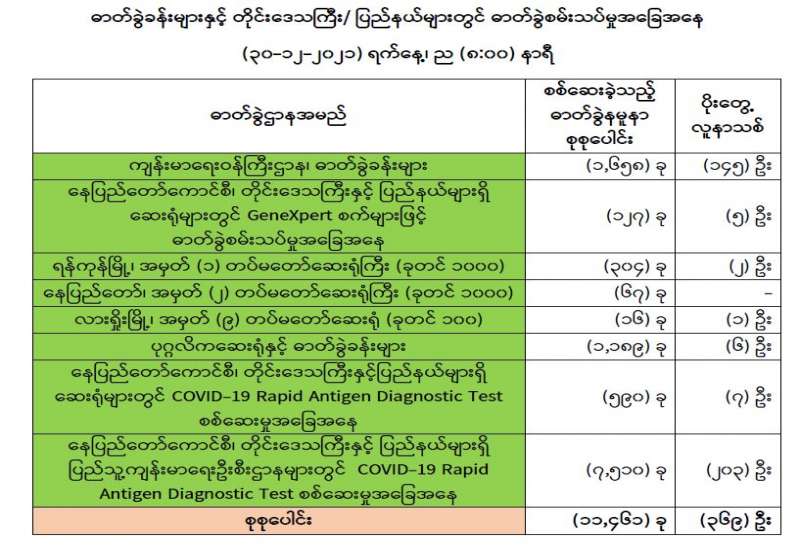ကျန်းမာရေးဝန်ကြီးဌာနအနေဖြင့် နိုင်ငံအတွင်း ကူးစက်ဖြစ်ပွားနေသော COVID-19 ရောဂါ ကာကွယ်၊ ကုသ၊ ထိန်းချုပ်ရေးလုပ်ငန်းများကို အရှိန်အဟုန်မြှင့်ဆောင်ရွက်လျက်ရှိပါသည်။