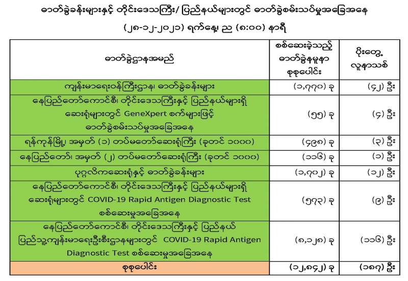 ကျန်းမာရေးဝန်ကြီးဌာနအနေဖြင့် နိုင်ငံအတွင်း ကူးစက်ဖြစ်ပွားနေသော COVID-19 ရောဂါ ကာကွယ်၊ ကုသ၊ ထိန်းချုပ်ရေးလုပ်ငန်းများကို အရှိန်အဟုန်မြှင့် ဆောင်ရွက်လျက်ရှိပါသည်။