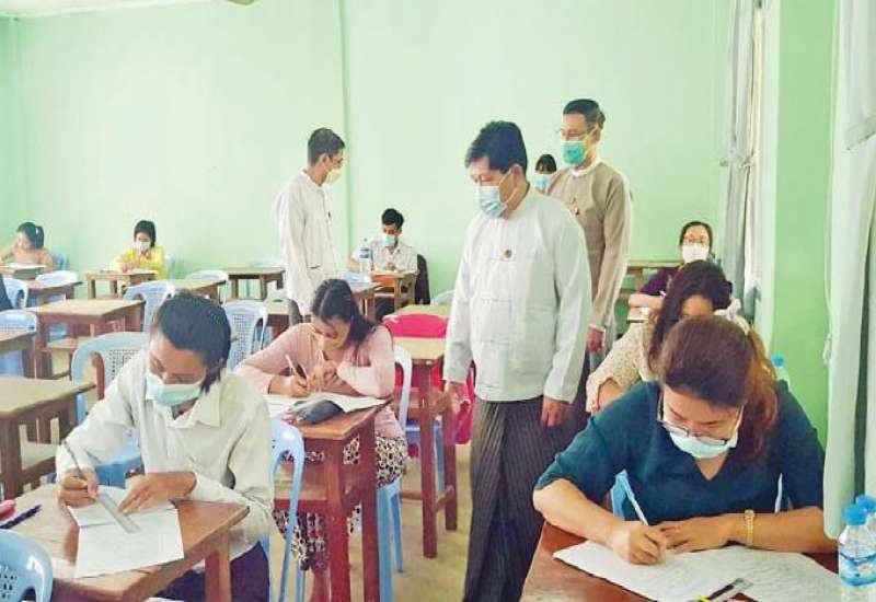 ဆောက်လုပ်ရေးဝန်ကြီးဌာန၊ မြို့ပြနှင့်အိမ်ရာ ဖွံ့ဖြိုးရေးဦးစီးဌာနတွင် လစ်လပ်လျက်ရှိသော ဒုတိယဦးစီးမှူး၊ အငယ်တန်းအင်ဂျင်နီယာ (၂)၊ ပုံဆွဲ (၂) နှင့် စာရင်းကိုင် (၂) ရာထူးအလွှာ ၈၃ နေရာ ရွေးချယ်ခန့်ထားနိုင်ရေးအတွက် သတင်းစာတွင် ကြော်ငြာထည့်သွင်း လျှောက်လွှာခေါ်ယူခဲ့သော ရေးဖြေစာမေးပွဲကို ယနေ့နံနက်ပိုင်းက နေပြည်တော်ကောင်စီနယ်မြေရှိ အမှတ်(၅) အခြေခံပညာ အထက်တန်းကျောင်း၌ ကိုဗစ်-၁၉ စည်းကမ်းချက်များနှင့်အညီ ကျင်းပရာ ဒုတိယဝန်ကြီး ဦးမင်းထိန်နှင့် တာဝန်ရှိသူများသည် ရေးဖြေစာမေးပွဲဖြေဆိုနေမှုကို လှည့်လည် ကြည့်ရှုအားပေးသည်။
