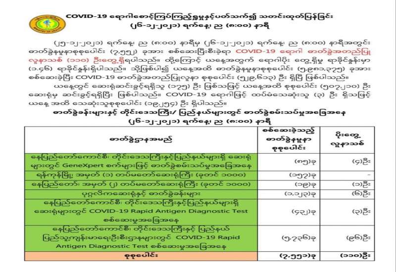 စီးပွားရေးနှင့် ကူးသန်းရောင်းဝယ်ရေးဝန်ကြီးဌာနအနေဖြင့် ကိုဗစ်-၁၉ ရောဂါ ကာကွယ်၊ ထိန်းချုပ်၊ ကုသရေးဆိုင်ရာပစ္စည်းများကို လေကြောင်း၊ ပင်လယ်ရေကြောင်းနှင့် နယ်စပ်ကုန်သွယ်ရေး စခန်းများမှ နှောင့်နှေးကြန့်ကြာမှုမရှိ တင်သွင်းနိုင်ရေးအတွက် အချိန်နှင့်တစ်ပြေးညီစီစဉ် ဆောင်ရွက်ပေးလျက်ရှိရာ ယနေ့တွင် မူဆယ် (၁၀၅) မိုင် ကုန်သွယ်ရေးဇုန်နှင့် ချင်းရွှေဟော် ကုန်သွယ်ရေးစခန်းတို့မှ ကုမ္ပဏီ (၄) ခု၊ ယာဉ်စီးရေ (၇) စီးဖြင့် အောက်ဆီဂျင်အရည် Storage Container/Tank (၁) ခု၊ အောက်ဆီဂျင်အရည် Distributor (၁) ခု၊ အိမ်သုံးအောက်ဆီဂျင်စက် (Oxygen Concentrator) (၈၀)၊ PPE ဝတ်စုံ (၁၉,၄၀၀) နှင့် နှာခေါင်းစည်း (Mask) (၁၂) တန်တို့ကို တင်သွင်းခဲ့ကြောင်း သိရသည်။