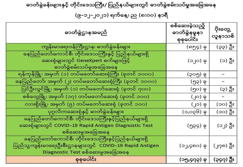ကျန်းမာရေးဝန်ကြီးဌာနအနေဖြင့် နိုင်ငံအတွင်း ကူးစက်ဖြစ်ပွားနေသော COVID-19 ရောဂါ ကာကွယ်၊ ကုသ၊ ထိန်းချုပ်ရေးလုပ်ငန်းများကို အရှိန်အဟုန်မြှင့်ဆောင်ရွက်လျက်ရှိရာ ရောဂါထိန်း ချုပ်ရေးလုပ်ငန်းများ အောင်မြင်နိုင်ရေးအတွက် ပြည်သူလူထုအနေဖြင့် ကျန်းမာရေးဝန်ကြီးဌာနမှ ထုတ်ပြန်ထားသော COVID-19 ရောဂါကာကွယ်ထိန်းချုပ်ရေးဆိုင်ရာစည်းကမ်းများကို စနစ်တကျ လိုက်နာဆောင်ရွက်ရန်လိုအပ်ပြီး COVID-19 ကာကွယ်ဆေးထိုးနှံမှုခံယူခြင်းအား အထူးဂရုပြု ပူးပေါင်းဆောင်ရွက်ကြရန် လိုအပ်ပါသည်။