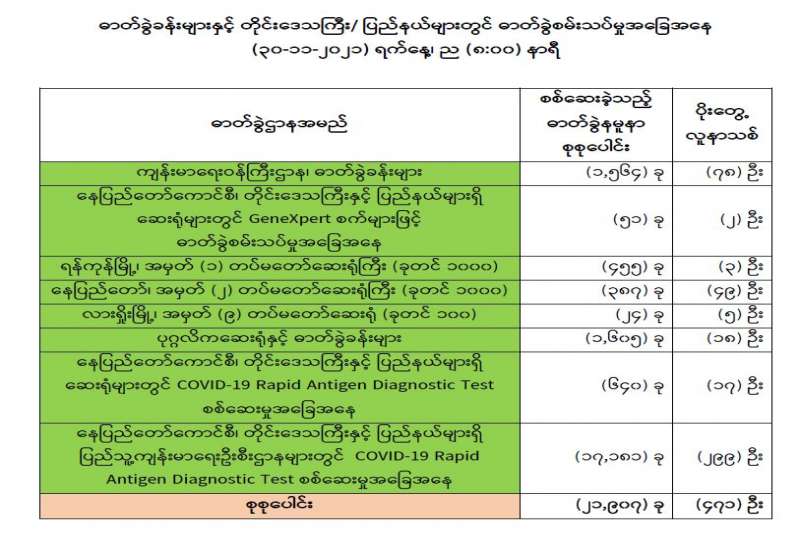 ကျန်းမာရေးဝန်ကြီးဌာနအနေဖြင့် နိုင်ငံအတွင်း ကူးစက်ဖြစ်ပွားနေသော COVID-19 ရောဂါ ကာကွယ်၊ ကုသ၊ ထိန်းချုပ်ရေးလုပ်ငန်းများကို အရှိန်အဟုန်မြှင့်ဆောင်ရွက်လျက်ရှိပါသည်။