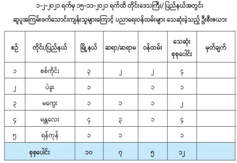 ပြည်ပနိုင်ငံများမှ ဝင်ရောက်လာသည့် မြန်မာနိုင်ငံသားများကိုနယ်စပ်ဂိတ် အသီးသီးတွင်လက်ခံဆောင်ရွက်ပေးလျက်ရှိရာ နိုဝင်ဘာ ၁၆ ရက်တွင် ရှမ်းပြည်နယ် (မြောက်ပိုင်း)၊ ချင်းရွှေဟော်မြို့သို့ ပြန်လည်ဝင်ရောက်လာသူ အမျိုးသား ၆၇ ဦး၊ အမျိုးသမီး ၂၄ ဦး၊ စုစုပေါင်း ၉၁ ဦးနှင့် လောက်ကိုင်မြို့သို့ပြန်လည်ဝင်ရောက်လာသူ မျိုးသား ၃ ဦး၊ အမျိုးသမီး ၂ ဦး စုစုပေါင်း ၅ ဦးတို့ကို အသီးသီးလက်ခံခဲ့ကြသည်။