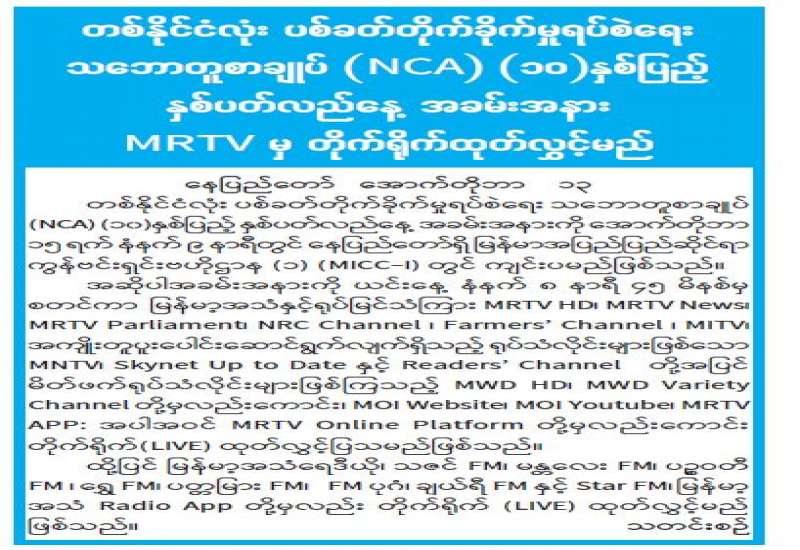 တစ်နိုင်ငံလုံးပစ်ခတ်တိုက်ခိုက်မှုရပ်စဲရေးသဘောတူစာချုပ် (NCA) (၁၀) နှစ်ပြည့် နှစ်ပတ်လည်နေ့ အခမ်းအနား MRTV မှ တိုက်ရိုက်ထုတ်လွှင့်မည်