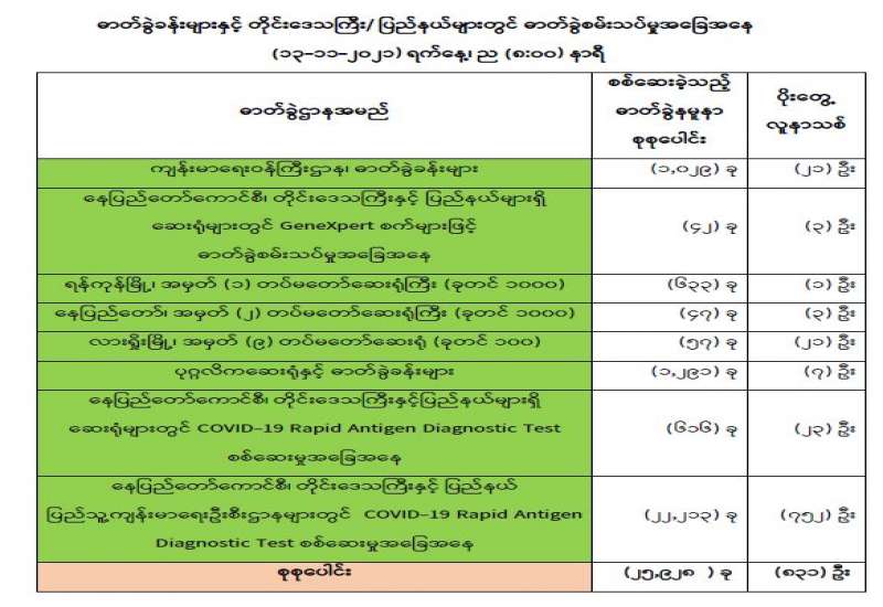 ကျန်းမာရေးဝန်ကြီးဌာနအနေဖြင့် နိုင်ငံအတွင်း ကူးစက်ဖြစ်ပွားနေသော COVID-19 ရောဂါ ကာကွယ်၊ ကုသ၊ ထိန်းချုပ်ရေး လုပ်ငန်းများကို အရှိန်အဟုန်မြှင့် ဆောင်ရွက်လျက်ရှိပါသည်။