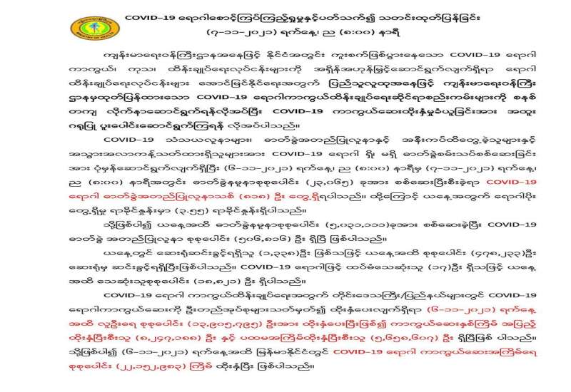 ကျန်းမာရေးဝန်ကြီးဌာနသည် ကိုဗစ်-၁၉ ရောဂါ ကာကွယ်ထိန်းချုပ်ရေးအတွက် တိုင်းဒေသကြီး/ ပြည်နယ်များတွင် ကိုဗစ်-၁၉ရောဂါ ကာကွယ်ဆေးကို ဦးတည်အုပ်စုများသတ်မှတ်၍ ထိုးနှံပေးလျက် ရှိသည်။