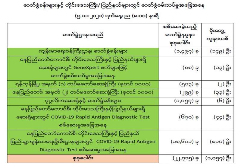 ကျန်းမာရေးဝန်ကြီးဌာနအနေဖြင့် နိုင်ငံအတွင်း ကူးစက်ဖြစ်ပွားနေသော COVID-19 ရောဂါ ကာကွယ်၊ ကုသ၊ ထိန်းချုပ်ရေးလုပ်ငန်းများကို အရှိန်အဟုန်မြှင့်ဆောင်ရွက်လျက်ရှိပါသည်။