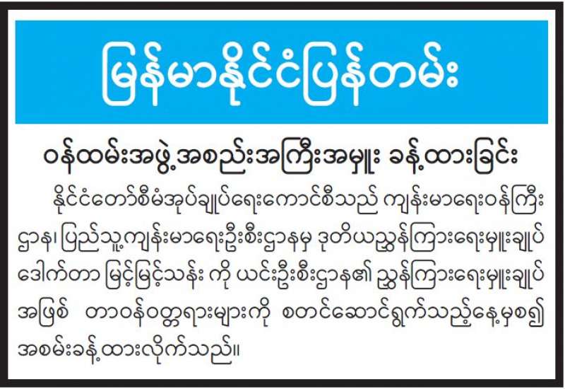 ပြည်ထောင်စုရွေးကောက်ပွဲကော်မရှင်နှင့် နိုင်ငံရေးပါတီများမှ ကိုယ်စားလှယ်များ၊ စိတ်ပါ ဝင်စားသူများပါဝင်သော ရွေးကောက်ပွဲစနစ် ဆွေးနွေးပွဲကို ယနေ့နံနက် ၉ နာရီက ရန်ကုန်မြို့၊ ရန်ကုန်တိုင်းဒေသကြီး အစိုးရအဖွဲ့ရုံး၊ မင်္ဂလာခန်းမ၌ ကျင်းပသည်။