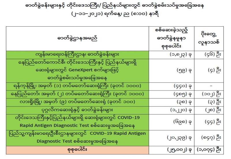 စီးပွားရေးနှင့် ကူးသန်းရောင်းဝယ်ရေးဝန်ကြီးဌာနအနေဖြင့် ကိုဗစ်၁၉ရောဂါ ကာကွယ်၊ ထိန်းချုပ်၊ ကုသရေးဆိုင်ရာပစ္စည်းများကို လေကြောင်း၊ ရေကြောင်းနှင့် နယ်စပ်ကုန်သွယ်ရေး စခန်းများမှ နှောင့်နှေးကြန့်ကြာမှုမရှိ တင်သွင်းနိုင်ရေးအတွက် အချိန်နှင့်တစ်ပြေးညီ စီစဉ်ဆောင်ရွက်ပေးလျက်ရှိရာ ယနေ့တွင် ရန်ကုန်အပြည်ပြည်ဆိုင်ရာ ဆိပ်ကမ်းများ၊ ချင်းရွှေဟော်နှင့် မြဝတီကုန်သွယ်ရေးစခန်းနှစ်ခုတို့မှ တင်သွင်းရာ၌ ကုမ္ပဏီ ငါးခုမှ ယာဉ်စီးရေ ခုနစ်စီးဖြင့် အောက်ဆီဂျင် (အရည်) Bowser နှစ်စီးဖြင့် တန် ၄၀ ၊ လုပ်ငန်းသုံးအောက်ဆီဂျင်စက် (Oxygen Generator တစ်ခု၊ အောက်ဆီဂျင်အိုးခွံ ၁၄၃၈ ခု၊ PPE ဝတ်စုံ ၆၃၆၀၀ နှင့် နှာခေါင်းစည်း ၃၂ တန်တို့ကို တင်သွင်းခဲ့ပြီး အောက်ဆီဂျင် (အရည်) Bowser ယာဉ်နှစ်စီးမှာ မြဝတီကုန်သွယ်ရေးဇုန်မှ ရန်ကုန်မြို့နှင့် မော်လမြိုင်မြို့တို့သို့ တစ်စီးစီဖြစ်ကြောင်း သိရသည်။