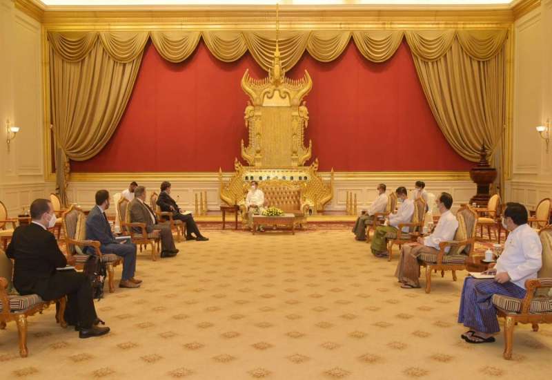 နိုင်ငံတော်စီမံအုပ်ချုပ်ရေးကောင်စီဥက္ကဋ္ဌ နိုင်ငံတော်ဝန်ကြီးချုပ် ဗိုလ်ချုပ်မှူးကြီး မင်းအောင်လှိုင်သည် အမေရိကန်နိုင်ငံ၊ နယူးမက္ကဆီကိုပြည်နယ် အုပ်ချုပ်ရေးမှူးဟောင်း မစ္စတာဘီလ်ရစ်ချတ်ဆန်အား ယနေ့နံနက်ပိုင်းတွင် နေပြည်တော်ရှိ နိုင်ငံတော်စီမံအုပ်ချုပ်ရေးကောင်စီရုံး၊ သံတမန်ဆောင်ဧည့်ခန်းမ၌ လက်ခံတွေ့ဆုံသည်။
