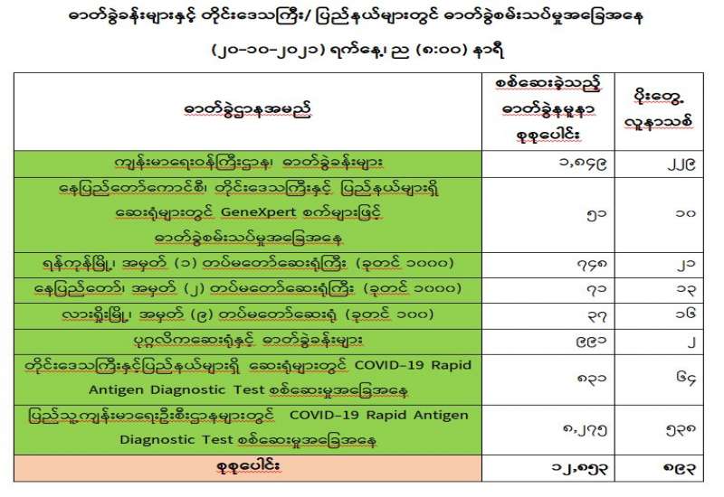 ကျန်းမာရေးဝန်ကြီးဌာနအနေဖြင့် နိုင်ငံအတွင်း ကူးစက်ဖြစ်ပွားနေသော COVID-19 ရောဂါ ကာကွယ်၊ ကုသ၊ ထိန်းချုပ်ရေးလုပ်ငန်းများကို အရှိန်အဟုန်မြှင့်ဆောင်ရွက်လျက်ရှိရာ ရောဂါ ထိန်းချုပ်ရေးလုပ်ငန်းများ အောင်မြင်နိုင်ရေးအတွက် ပြည်သူလူထုအနေဖြင့် ကျန်းမာရေးဝန်ကြီး ဌာနမှ ထုတ်ပြန်ထားသော COVID-19 ရောဂါကာကွယ်ထိန်းချုပ်ရေးဆိုင်ရာ စည်းကမ်းများကို စနစ်တကျ လိုက်နာဆောင်ရွက်ရန်လိုအပ်ပြီး COVID-19 ကာကွယ်ဆေးထိုးနှံမှုခံယူခြင်းအား အထူး ဂရုပြု ပူးပေါင်းဆောင်ရွက်ကြရန် လိုအပ်ပါသည်။