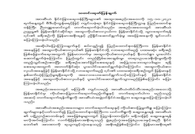 မြန်မာ့နိုင်ငံရေးအပြောင်းအလဲနှင့်စပ်လျဉ်း၍ ပြီးခဲ့သည့် ဧပြီလ ၂၄ ရက်နေ့တွင် အင်ဒိုနီးရှား နိုင်ငံ၊ ဂျကာတာမြို့၌ ပြုလုပ်ခဲ့သည့် အာဆီယံခေါင်းဆောင်များ အစည်းအဝေးအတွင်း သဘောတူညီခဲ့သည့် တူညီဆန္ဒ (၅) ရပ် အကောင်အထည်ဖော်မှုကို မြန်မာနိုင်ငံက အပြုသဘောဖြင့် ဆက်လက်ပူးပေါင်း ဆောင်ရွက်သွားမည်ဟု နိုင်ငံခြားရေးဝန်ကြီးဌာန၏ အောက်တိုဘာလ ၁၄ ရက်နေ့က သတင်းထုတ်ပြန်ချက်တွင် ဖော်ပြထားသည်။ ထို့အပြင် အဆိုပါ တူညီဆန္ဒ (၅) ရပ် အကောင်အထည်ဖော်မှုအရ အာဆီယံဥက္ကဋ္ဌ၏ အထူးကိုယ်စားလှယ် အဖြစ်ခန့်အပ်ထားသည့် ဘရူနိုင်းနိုင်ငံခြားရေးဝန်ကြီး (၂) နှင့် ထိတွေ့ဆွေးနွေးမှုများ ပြုလုပ် ခဲ့သလို မြန်မာနိုင်ငံသို့ ၎င်းလာရောက်နိုင်ရေးအတွက်လည်း ပြင်ဆင်မှု၊ စီစဉ်မှုနှင့် လိုက်လျောမှု တို့ကို အတတ်နိုင်ဆုံး ပြုလုပ်ပေးခဲ့သည်။