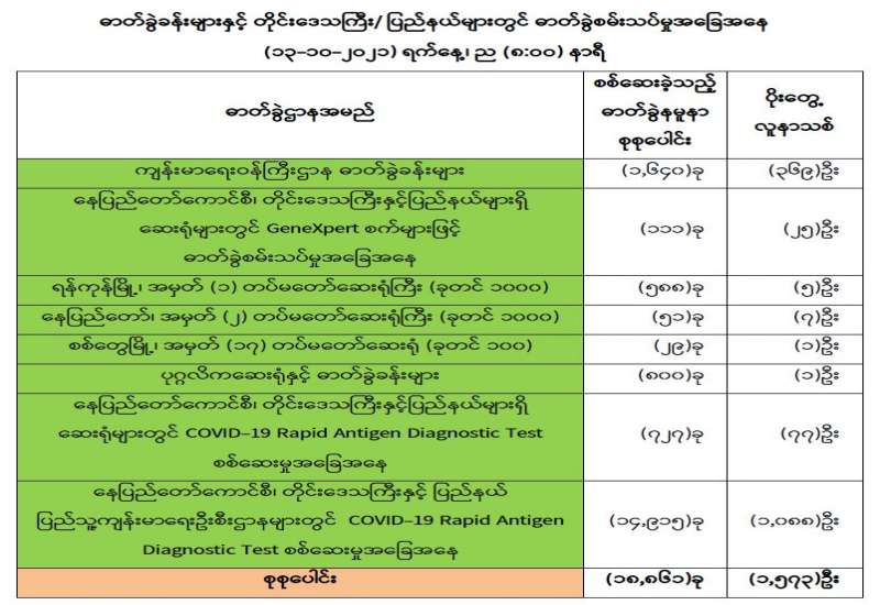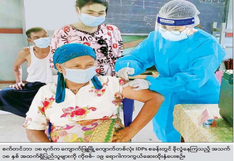 ကျန်းမာရေးဝန်ကြီးဌာနအနေဖြင့် ကိုဗစ်-၁၉ ရောဂါကို ထိရောက်စွာ ကာကွယ် ထိန်းချုပ်ရေးအတွက် ကာကွယ်ဆေးထိုးနှံပေးခြင်းကို ဦးစားပေးအုပ်စုများ သတ်မှတ်၍ ဦးစားပေးအစီအစဉ်အလိုက် ဆောင်ရွက်လျက်ရှိပါသည်။ (၁၂-၁၀၂၀၂၁) ရက်နေ့အထိလူဦးရေ (၁၀.၆) သန်းခန့်အား ကာကွယ် ဆေးထိုးနှံပေးပြီးဖြစ်၍ နှစ်ကြိမ်အပြည့်ထိုးနှံပြီးစီးသူ (၄.၂) သန်းခန့်၊ ပထမအကြိမ် ထိုးနှံပြီးစီးသူ (၆.၄) သန်းခန့်နှင့် ကာကွယ်ဆေးအကြိမ်ရေ စုစုပေါင်း (၁၄.၈) သန်းခန့် ထိုးနှံပြီးဖြစ်ပါ သည်။ ကာကွယ်ဆေးနှစ်ကြိမ်အပြည့် လွှမ်းခြုံမှုရာခိုင်နှုန်းမှာ အသက် ၁၈ နှစ်နှင့် အထက် လူဦးရေ၏ (၁၂) ရာခိုင်နှုန်းခန့် ရရှိပြီးဖြစ်ပါသည်။ ကာကွယ်ဆေးလွှမ်းခြုံ မှုရာခိုင်နှုန်းများ ယခုထက်ပိုမိုတိုးတက် ရရှိစေရေး ဆက်လက်၍ အရှိန်အဟုန်မြှင့်တင် ဆောင်ရွက်လျက်ရှိပါသည်။