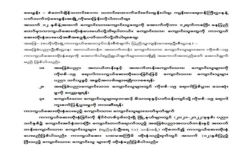 ကိုဗစ်-၁၉ ရောဂါ ကာကွယ်၊ ထိန်းချုပ်၊ ကုသရေး ဆောင်ရွက်ရာတွင် ကာကွယ်ဆေးထိုးနှံခြင်းသည် အဓိကအခန်းကဏ္ဍတွင် ပါဝင်သည့် လုပ်ငန်းတစ်ရပ် ဖြစ်သောကြောင့် ကိုဗစ်-၁၉ ရောဂါ ကာကွယ်ဆေးထိုးနှံမှုကို တိုင်းဒေသကြီးနှင့် ပြည်နယ်အသီးသီးတို့၌ တပ်မတော်မှ ဆေးအဖွဲ့များ၊ ပြည်သူ့ဆေးရုံများမှ ဆရာဝန် များ၊ သူနာပြုများ၊ ကျန်းမာရေးဝန်ထမ်းများနှင့် စေတနာ့ဝန်ထမ်းများက ကာကွယ် ဆေးထိုးခြင်းလုပ်ငန်းများကို အင်တိုက်အားတိုက် ဆောင်ရွက်ပေးလျက်ရှိ သည်။