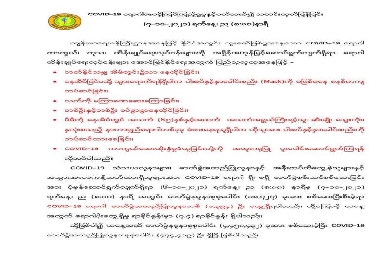ကိုဗစ်-၁၉ ရောဂါ အတည်ပြုလူနာများနှင့် သီးသန့်စောင့်ကြည့် ရမည့်သူများထားရှိရန်အတွက် တိုင်းစစ်ဌာနချုပ် နယ်မြေအသီးသီးရှိ တပ်မတော်ဆေးရုံများ၊ နယ်မြေခံသင်တန်းကျောင်းများ၊ စစ်ကြောရေးနှင့် တည်းခိုရေးစခန်းများ၌ စနစ်တကျလက်ခံ၍ ကျန်းမာရေး စောင့်ရှောက်မှုလုပ်ငန်းများ ဆောင်ရွက်ပေးလျက်ရှိသည်။ ထို့ပြင် ကျန်းမာရေးဝန်ကြီးဌာနနှင့် အခြားဌာနဆိုင်ရာ တာဝန်ရှိသူများ၊ ပရဟိတအဖွဲ့ အစည်းများ၊ တာဝန်သိပြည်သူများနှင့် ပူးပေါင်း၍ လည်း သက်ဆိုင်ရာ မြို့နယ်များ၌ Quarantine Center များ ဖွင့်လှစ် ဆောင်ရွက်ပေးလျက်ရှိသည်။