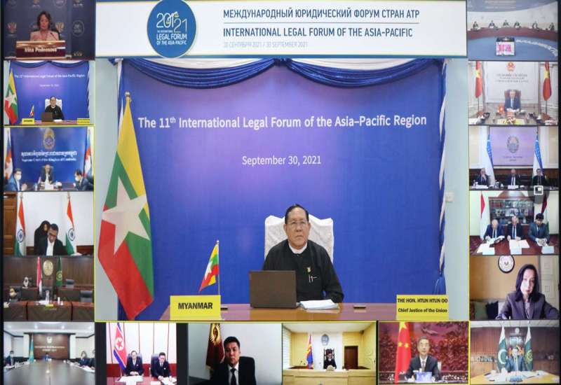 ရုရှားဖယ်ဒရေးရှင်းနိုင်ငံ၊ တရားရုံးချုပ်မှ ကြီးမှူး၍ (၁၁) ကြိမ်မြောက် အာရှ-ပစိဖိတ် ဆိုင်ရာ နိုင်ငံတကာဥပဒေဖိုရမ် (The 11th International Legal Forum of the Asia-Pacific Region) ကို ယနေ့မွန်းလွဲပိုင်းတွင် ဗီဒီယိုကွန်ဖရင့်စနစ်ဖြင့် ကျင်းပရာ ပြည်ထောင်စုတရားသူကြီးချုပ် ဦးထွန်းထွန်းဦး နေပြည်တော်ရှိ ပြည်ထောင်စုတရားလွှတ်တော်ချုပ်မှ ပါဝင်တက်ရောက်သည်။