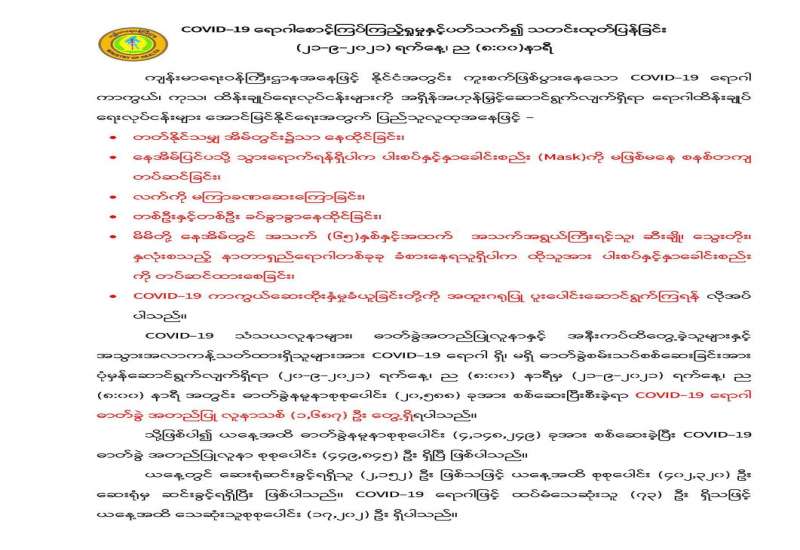 အကောက်ခွန်ဦးစီးဌာနအနေဖြင့် ကိုဗစ်-၁၉ ရောဂါ ကာကွယ်၊ ထိန်းချုပ်၊ ကုသရေး ပစ္စည်းများကို ရေကြောင်း၊ လေကြောင်း၊ ဆိပ်ကမ်း၊ နယ်စပ်ဂိတ် အသီးသီးမှ နေ့စဉ်လွယ်ကူ ချောမွေ့စွာ စစ်ဆေးထုတ်ပေး လျက်ရှိသည်။ စက်တင်ဘာ ၂၀ ရက်က ရန်ကုန် အပြည်ပြည် ဆိုင်ရာ လေဆိပ်တွင် ကုမ္ပဏီ သုံးခုမှ Zinc Tablets ၁၄၆ ခု၊ Paracetamol Tablets ၃၈၃၂ ခု၊ Benzyl Benzoate Lotion ၁၁၅၀၊ Phytomenadi အခု ၆၀၊ Vitamin-C Tablets ၇၀၇၄ ခု၊ Vitamin-C + Zinc Tablets ၅၀၄၄ ခု၊ Amero Powder For Injection အခု ၁၅၀၀၀၊ Faceshield အခု ၁၇၀၀၀၊ Thermometer ၁၂၇၇ ခု၊ Mask အခု ၈၅၀၊