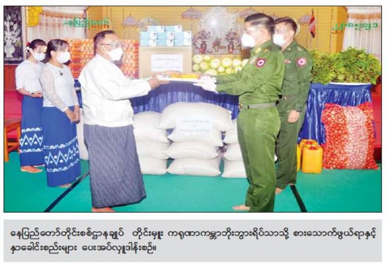ကိုဗစ်- ၁၉ ရောဂါ ကာကွယ်၊ ထိန်းချုပ်၊ ကုသရေးလုပ်ငန်းများကို အရှိန်အဟုန်မြှင့် ဆောင်ရွက် လျက်ရှိရာ သွားလာမှုကန့်သတ်ချက်များကြောင့် စစ်မှုထမ်းဟောင်း အဖွဲ့ဝင်များ၊ မြန်မာနိုင်ငံ ရဲတပ်ဖွဲ့ဝင်များ၊ ပြည်သူ့စစ်(ဌာနေ)တပ်ဖွဲ့ဝင်များ၊ ကျန်းမာရေးဝန်ထမ်းများ၊ စေတနာ့ဝန်ထမ်း Volunteerများနှင့် ဒေသခံပြည်သူများ စားရေးအဆင်ပြေစေရေးအတွက် တပ်မတော်နှင့် စေတနာရှင် အလှူရှင်များက စားသောက်ဖွယ်ရာများ၊ ထောက်ပံ့ငွေများနှင့် ရောဂါကာကွယ်ရေးအထောက်အကူပြု ပစ္စည်းများကို ထောက်ပံ့လှူဒါန်းလျက်ရှိသည်။