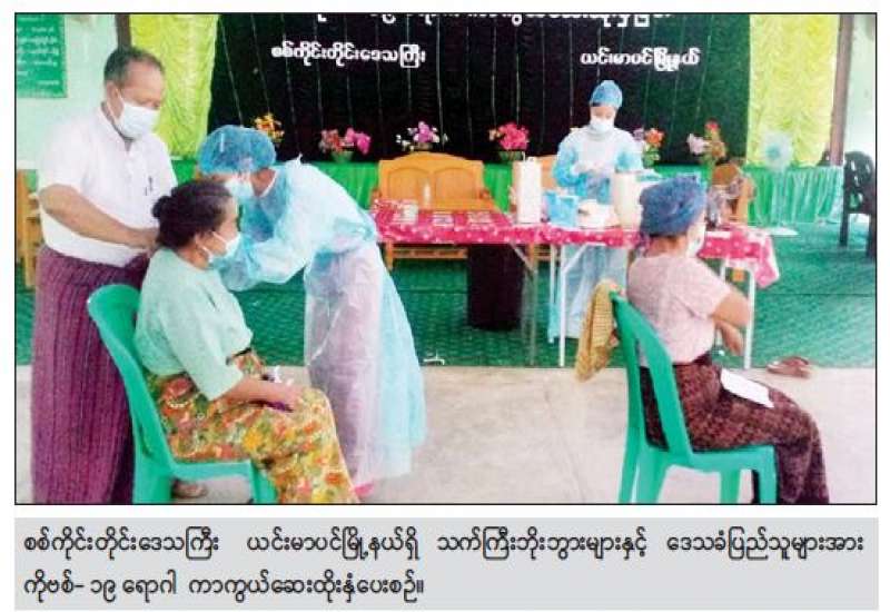 တိုင်းဒေသကြီးနှင့် ပြည်နယ်အသီးသီးရှိ ထေရ်ကြီးဝါကြီး ဆရာတော်ကြီးများ အပါအဝင် လူမျိုးမရွေး၊ ဘာသာမရွေး အသက်(၆၅)နှစ်အထက် သက်ကြီး ဘိုးဘွားများ၊ ဌာနဆိုင်ရာဝန်ထမ်းများ၊ တိုင်းရင်းသား ပြည်သူများနှင့် အကျဉ်းထောင်များ၌ ပြစ်ဒဏ်ကျခံနေသည့် အကျဉ်းသား၊ အကျဉ်းသူများအား ကိုဗစ်- ၁၉ ရောဂါ ကာကွယ်ဆေးထိုးနှံနိုင်ရေးအတွက် ဆေးနှင့်ဆေးပစ္စည်းများကို တပ်မတော် လေယာဉ် များ ဖြင့် သယ်ယူပို့ဆောင်ပေးခြင်းများနှင့် ကာကွယ်ဆေးထိုးနှံပေးခြင်းများကို ဝိုင်းဝန်း ကြိုးပမ်းဆောင်ရွက် လျက်ရှိသည်။