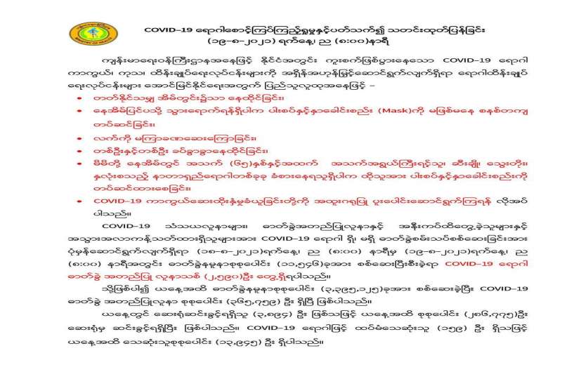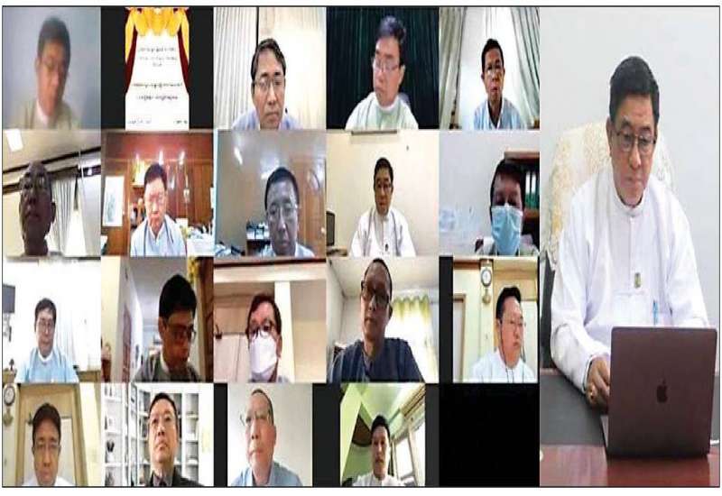 ဗဟိုအဆင့်ဆေးရုံအုပ်ကြီးများ၊ နေပြည်တော်၊ တိုင်းဒေသကြီး၊ ပြည်နယ် ပြည်သူ့ကျန်းမာရေးနှင့် ကုသရေး ဦးစီးဌာနမှူးများနှင့် လုပ်ငန်းညှိနှိုင်းအစည်းအဝေးကို ယနေ့နံနက်ပိုင်းတွင် ကျန်းမာရေး ဝန်ကြီးဌာန ပြည်ထောင်စုဝန်ကြီး ဒေါက်တာသက်ခိုင်ဝင်း ဦးဆောင်၍ Video Conferencing စနစ်ဖြင့် ကျင်းပကာ ဩဂုတ် ၁၆ ရက်က ကျင်းပခဲ့သည့် ကိုဗစ်-၁၉ ရောဂါ ကာကွယ်၊ ထိန်းချုပ်၊ ကုသရေးဆိုင်ရာ အဋ္ဌမအကြိမ် အစည်းအဝေးတွင် နိုင်ငံတော်စီမံအုပ်ချုပ်ရေးကောင်စီဥက္ကဋ္ဌ၊ ပြည်ထောင်စုသမ္မတ မြန်မာနိုင်ငံတော် အိမ်စောင့်အစိုးရအဖွဲ့ နိုင်ငံတော်ဝန်ကြီးချုပ် မှာကြားဆွေးနွေးချက်များအား ထပ်ဆင့်ရှင်းလင်းဆွေးနွေးသည်။