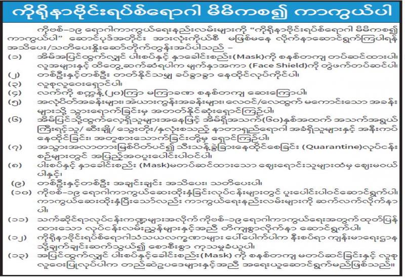 မြန်မာ့အသံနှင့် ရုပ်မြင်သံကြားမှ ဇူလိုင် ၃၁ ရက် ည ၈ နာရီသတင်းအပြီးတွင် ထုတ်လွှင့်ပြသခဲ့သည့် ကိုဗစ်- ၁၉ ရောဂါ ကာကွယ်ထိန်းချုပ်ရေးဆိုင်ရာ ဆောင်ရွက်ချက်များအကြောင်း သိကောင်းစရာ အစီအစဉ်ကို ပြည်သူများ သိရှိနိုင်ရန်အတွက် ပြန်လည်ဖော်ပြလိုက်ပါသည်။