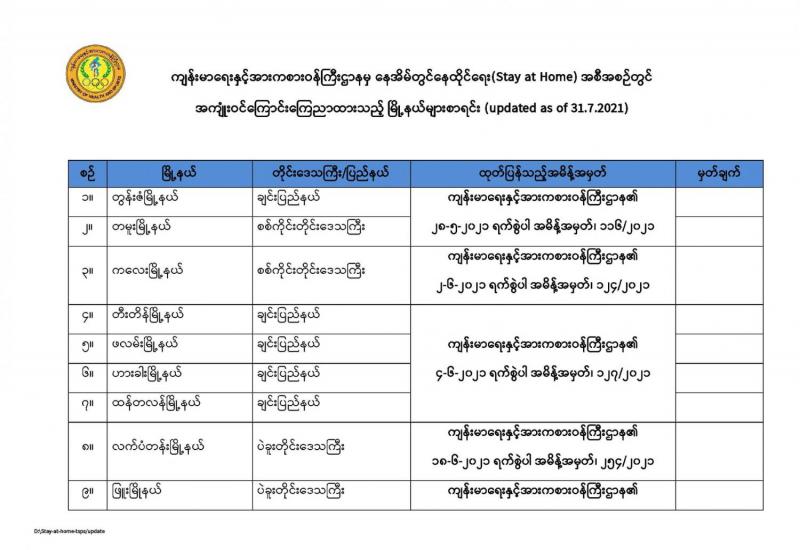 နိုင်ငံတော်အတွင်း၌ ကိုဗစ်-၁၉ ကာကွယ်၊ ထိန်းချုပ်၊ ကုသရေးလုပ်ငန်းများအတွက် အရေးတကြီး လိုအပ်လျက်ရှိသည့် အောက်ဆီဂျင်အရည်၊ အောက်ဆီဂျင်ဓာတ်ငွေ့၊ အိမ်သုံး အောက်ဆီဂျင်စက်နှင့် ဆေးဝါးနှင့်ဆက်စပ်ပစ္စည်းများပြတ်လပ်မှုမရှိစေရန် အများပြည်သူ ရုံးပိတ်ရက်များအဖြစ် သတ်မှတ်ကြေညာထားသည့် ဩဂုတ် ၂ ရက်မှ ၈ ရက်အထိ ရုံးပိတ်ရက်များ