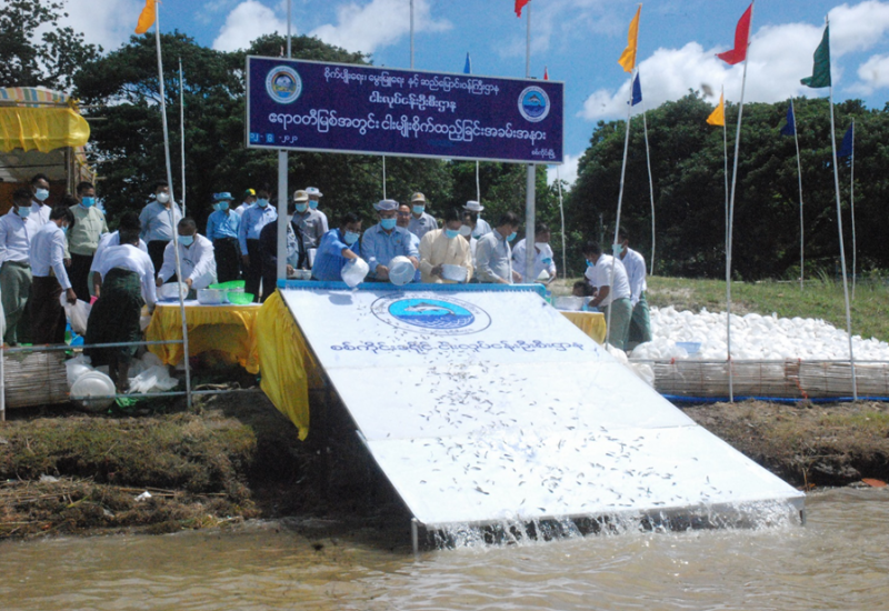 ဧရာဝတီမြစ်အတွင်း ငါးမျိုး စိုက်ထည့်ပွဲ အခမ်းအနားကို ဇွန် ၁၂ ရက် က စစ်ကိုင်းတံတားအနီး၌ ကျင်းပရာ စိုက်ပျိုးရေး၊မွေးမြူရေးနှင့် ဆည်မြောင်းဝန်ကြီးဌာန ဒုတိယဝန်ကြီး ဒေါက်တာအောင်ကြီး က ငါးမျိုးစိုက်ထည့်ပေးသည်။