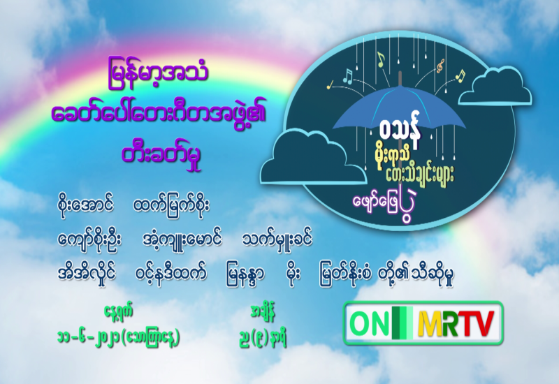 ဝဿန်မိုးရာသီ တေးသီချင်းများ ဖျော်ဖြေပွဲ၏ ပွဲစဉ်(၂)ကို ဇွန်(၁၁)ရက်၊ သောကြာနေ့ ည(၈)နာရီ သတင်း အပြီး တွင် မြန်မာ့အသံနှင့်ရုပ်မြင်သံကြား၌ ထုတ်လွှင့် ပြသမည် ဖြစ်သည်။