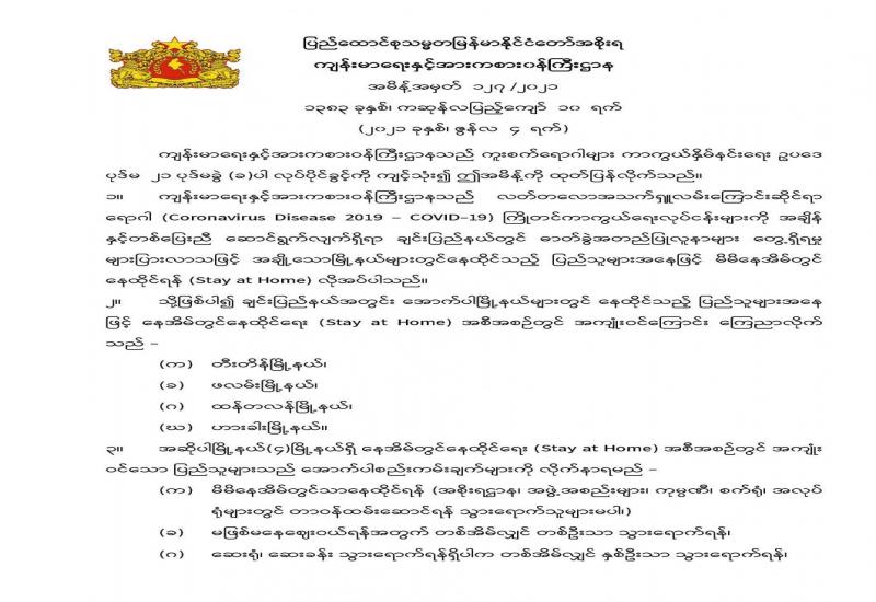 မြန်မာနိုင်ငံတွင် မေလ ၂၇ ရက်နေ့မှစတင်၍ ကိုဗစ်-၁၉ ရောဂါကူးစက်မှု အစုလိုက် ဖြစ်ပွားလာခဲ့သည်။ အစုလိုက်ဖြစ်ပွားလာရခြင်းမှာ မြန်မာနိုင်ငံ၏အနောက်ဘက် နယ်စပ်မြို့အချို့တွင် စတင်တွေ့ရှိလာရပြီး ယခုအခါ အဆိုပါမြို့များကို နေအိမ်အတွင်းသာ နေထိုင်ရေး (Stay at Home) အစီအစဉ်ထုတ်ပြန်ကာ ရောဂါကာကွယ် ထိန်းချုပ်ရေးကို အလေးထားဆောင်ရွက်လျက်ရှိသည်။