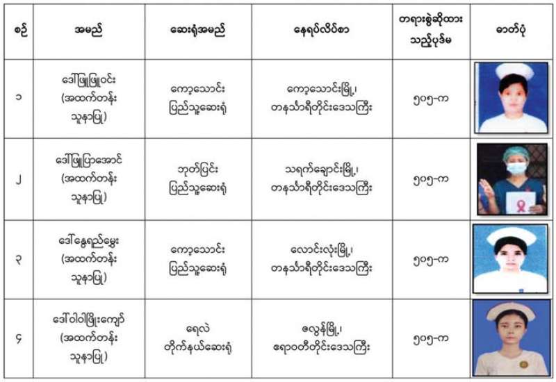 နိုင်ငံတော်၏အုပ်ချုပ်မှုယန္တရားပျက်ပြားစေရန် ရည်ရွယ်ချက်ဖြင့် နိုင်ငံ့ဝန်ထမ်း များနှင့် ကျန်းမာရေး ဝန်ထမ်းများအား CDM လှုပ်ရှားမှုများတွင် ပါဝင်လာစေရန် လှုံ့ဆော်ခြင်း၊ ၎င်းတို့ကိုယ်တိုင် CDM လှုပ်ရှား မှုများတွင် ပါဝင်လုပ်ဆောင်ခြင်း၊ CDM လှုပ်ရှားမှုအပေါ် ထောက်ခံအားပေးခြင်း၊ အကြမ်းဖက်အုပ်စုများအဖြစ် သတ်မှတ် ကြေညာ ထားသည့် CRPH နှင့် NUG တို့အား ထောက်ခံအားပေးခြင်းတို့ကို ဆောင်ရွက် လျက်ရှိသည့် အောက်ဖော် ပြပါ သူနာပြုများအား ရာဇသတ်ကြီးပုဒ်မ ၅၀၅-က ဖြင့် အမှုဖွင့်အရေးယူဆောင်ရွက် ထားပြီးဖြစ် ပါသည်-